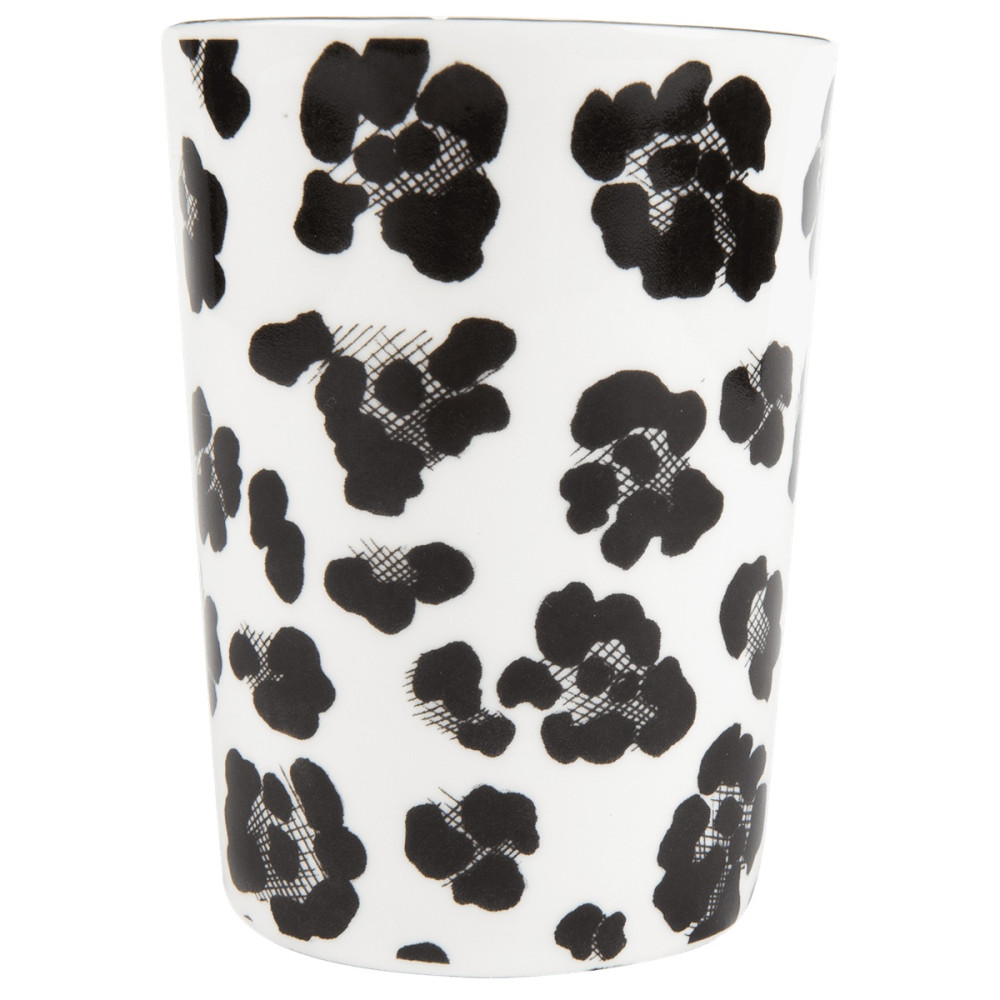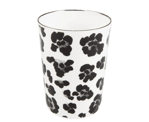 Изысканный стаканчик из белого костяного фарфора Leopard Print, украшенный одной из иллюстраций Рори, с замысловатым черно-белым рисунком. Золотая отделка 22 карата нанесена вручную по краю.
